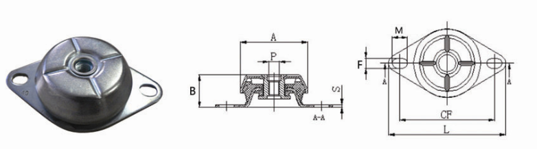| 型號(hào) | 橡膠硬度 IRHD (daN/mm) | A | B | P | F*M | CF | L | S | Average Stiffness平均值負(fù)荷(Kg/mm) | Max Load最大荷重(Kg) | Max Deflec.最大壓縮量(mm) |