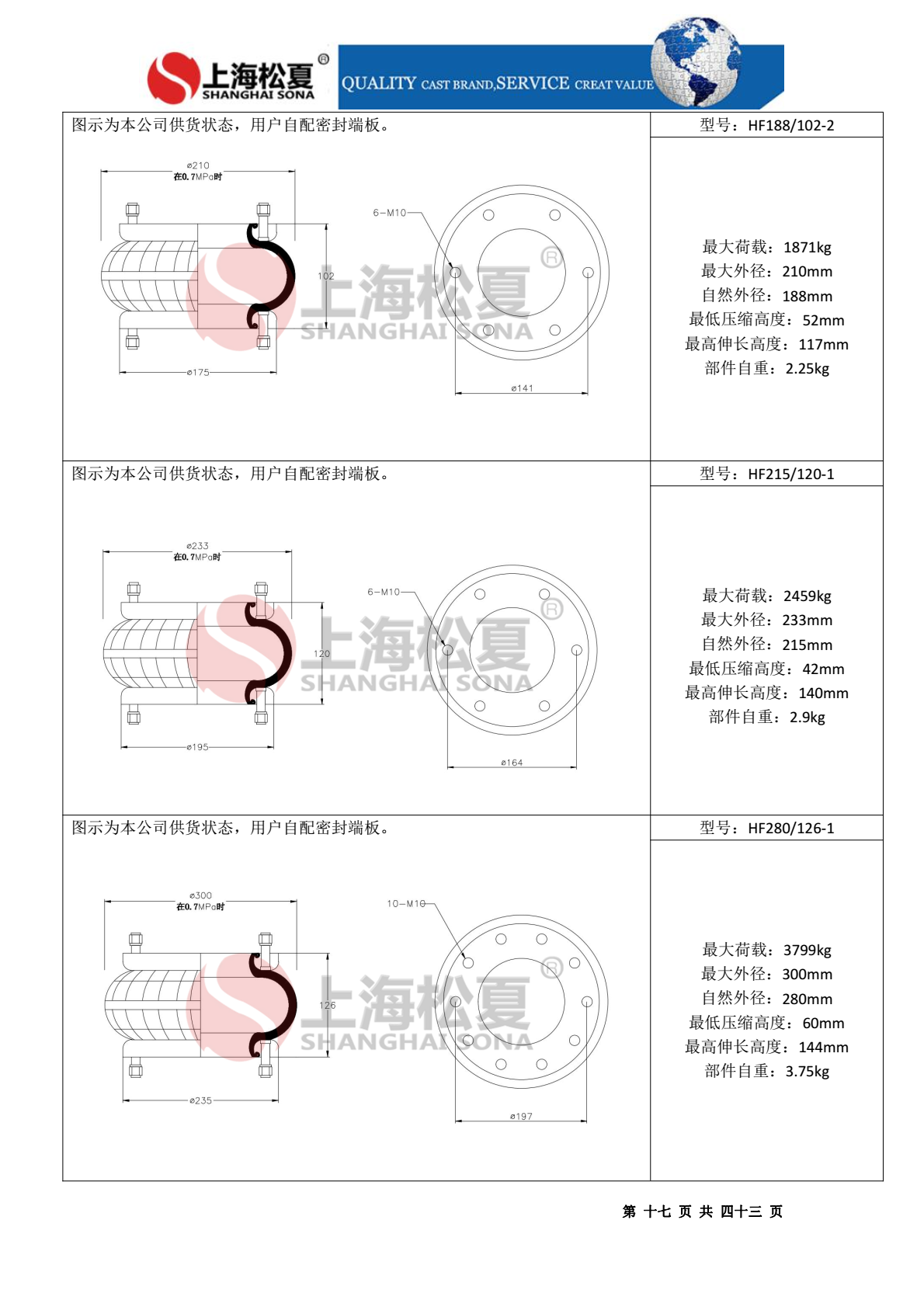 活套式橡膠空氣彈簧(HF型)結構: 1、密封端板(不包含組件)于產品配合面平整光滑,此板應有足夠強度在承受載荷時不會彎曲變形。 2、法蘭環:采用鋁制或鋼制 3、空氣彈簧:自身具有..
