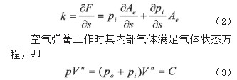 式中: k為空氣彈簧剛度;pi為空氣彈簧內(nèi)氣體工作壓力; po為大氣壓力;n為氣體的多變指數(shù);Ae為空氣彈簧有效承壓面積; V為空氣體積。