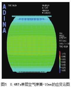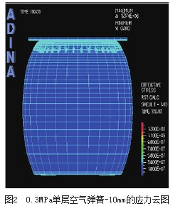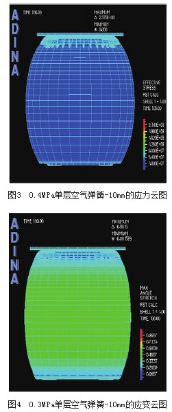 對(duì)自由膜式空氣彈簧的模擬工況為:空氣彈簧壓縮到-10mm位移時(shí),對(duì)有限元模型腔內(nèi)分別設(shè)定0.3MPa和0.4MPa的初始?jí)毫Γ芯坎煌跏級(jí)毫?duì)空氣彈簧垂直剛度.性的影響,應(yīng)力和應(yīng)變的云圖如圖2圖5所示。